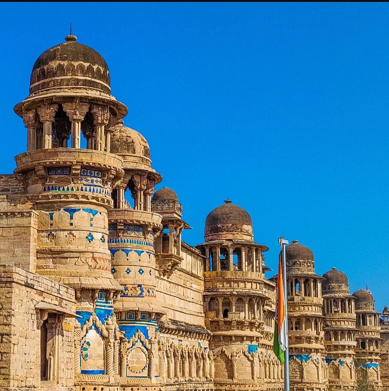 Built by Raja Man Singh Tomar between 1486 and 1516, Man Mandir Palace is the most iconic structure within Gwalior Fort. Its exterior is a riot of colour — elaborate glazed tiles in turquoise, green, yellow, and white form intricate geometric patterns featuring ducks, elephants, tigers, crocodiles, and banana trees. The palace has two levels above ground and two underground, with the lower floors featuring Jharokha windows, hanging balconies, and perforated stone screens. The underground chambers, originally royal apartments with sophisticated ventilation, were later converted into dungeons by the Mughals — Aurangzeb imprisoned and eventually executed his brother Murad here in 1661.